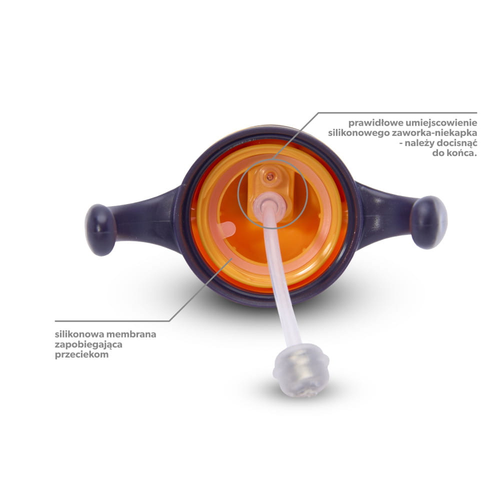 Bidon z silikonową słomką zakończoną odważnikiem umożliwia picie pod każdym kątem. Całkowicie wolny od bisfenolu A (0% BPA). Dziecko pije do ostatniej kropelki. Twój maluszek może pić przechylając kubek nawet do góry nogami. Niezastąpiony w domu i w podróży. Szczelne zamknięcie zapobiega wylewaniu się picia i chroni słomkę przed zabrudzeniem. Transparentność i wyraźna podziałka pozwala na kontrolowanie ilość płynu. Kubek można myć w zmywarce na górnej półce (ale bez słomki).