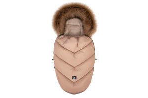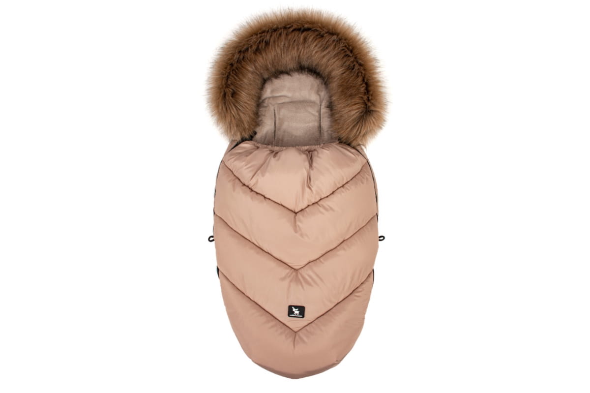 Kaptur śpiworka ozdobiony jest sztucznym, odpinanym futerkiem oraz posiada sznureczek umożliwiający jego regulację. W dolnej części zastosowane zostały szerokie zaszewki zapewniające dodatkową przestrzeń na buciki, a specjalna wyściółka zapewnia ochronę przed brudnymi bucikami.