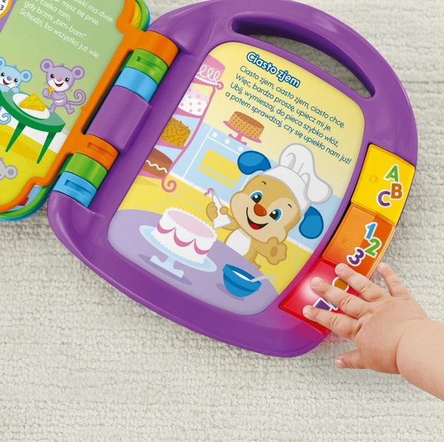- 6 klasycznych rymowanek do słuchania. Dziecko uczy się pierwszych słów, liczb, kształtów i kolorów! 3 podświetlane przyciski do nauki pierwszych słów, liczb i kształtów Łatwe do przewracania strony pomagają w rozwoju sprawności manualnej Górny uchwyt ułatwia przenoszenie.