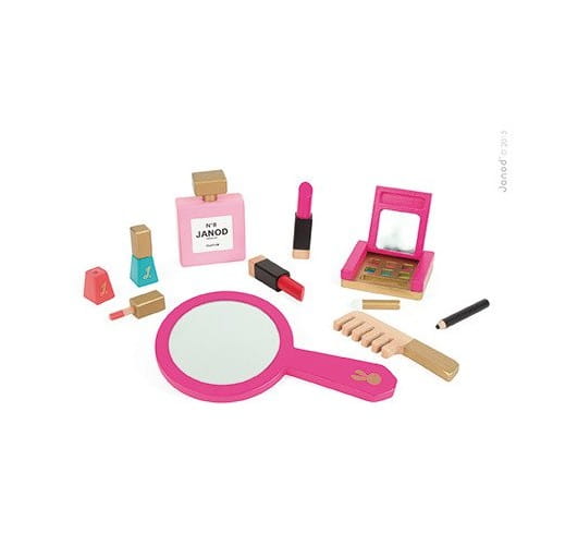 Elementy wykonane zostały z drewna i pomalowane bezpiecznymi dla dziecka farbami . W skład zestawu wchodzi 1 duże okrągłe lusterko , 1 paleta do makijażu cieniami w 6 kolorach i pędzelkiem/gąbeczka do nakładania ,2 szminki różowa i czerwona, 2 lakiery do paznokci różowy i niebieski (z wyciąganym pędzelkiem) , 1 eyeliner i 1 butelka perfum i 1 grzebień.Prostokątna kosmetyczka zamykana jest na suwak przez co zamknięcie jet bardzo komfortowe i wygodne łatwo ją przenosić z miejsca na miejsce . Akcesoria są wykonane w kolorze klasycznego różu ,odwzorowuje swoje "dorosłe" odpowiedniki .Odtwarzanie sytuacji znanych z obserwacji dobrze wpływa na wszechstronny rozwój dziecka .