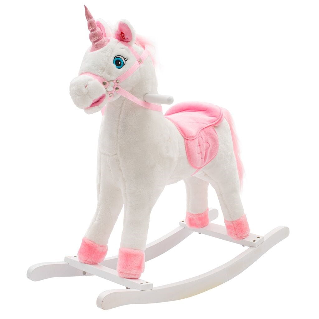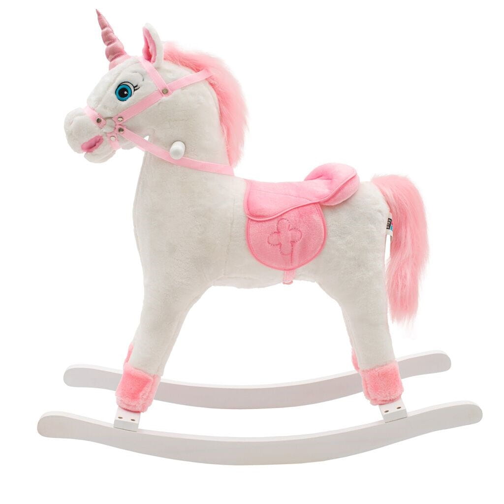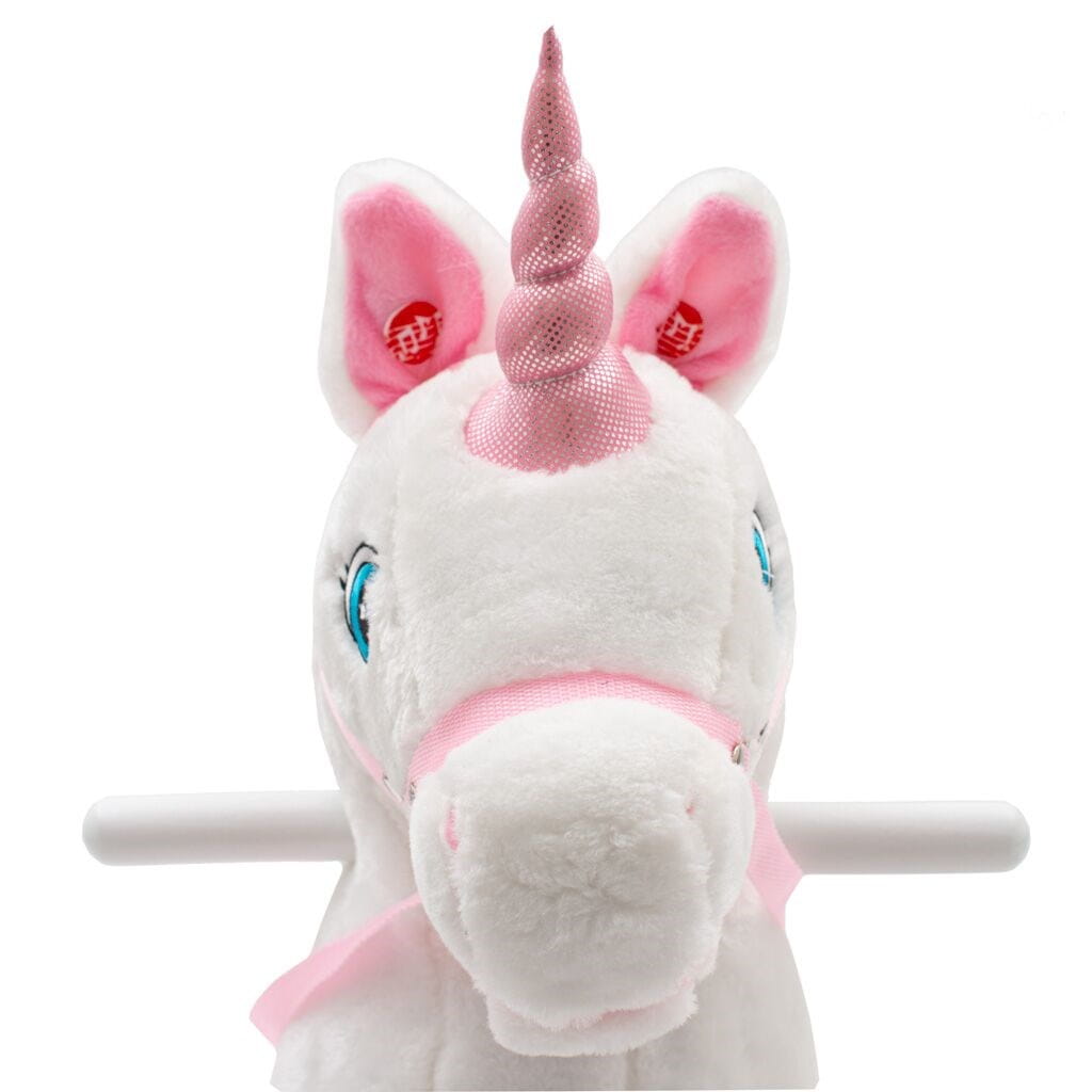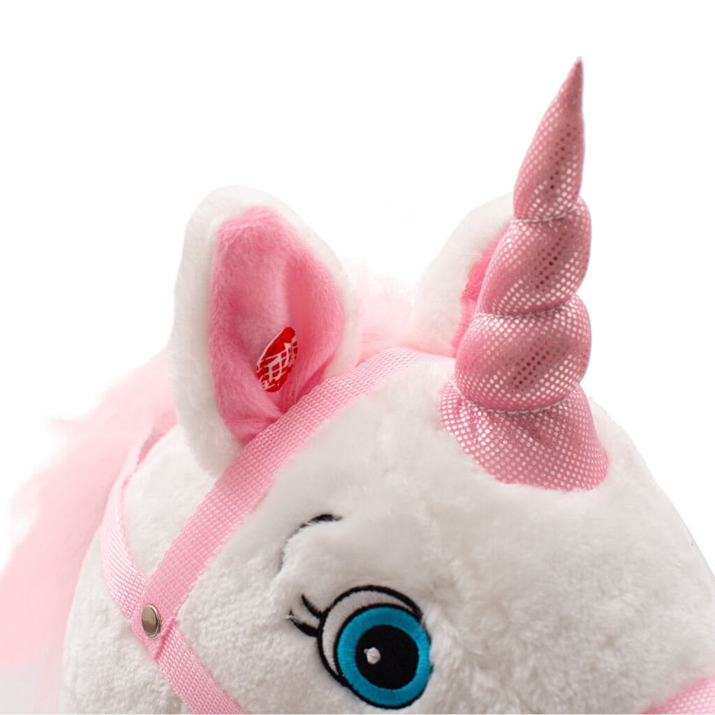 Mięciutki jednorożec na biegunach z melodią PlayTo zaprojektowany został z myślą o dziewczynkach lubiących przygody. Wygodne, wyprofilowane siodło zapewni komfort i bezpieczeństwo podczas beztroskiego bujania małej królowej. Konik posiada zdejmowane drewniane bieguny i rączki, które pomogą zachować równowagę podczas zabawy. Bujaczek wykonany jest z mięciutkiego i delikatnego w dotyku pluszowego materiału. Przy naciśnięciu uszek jednorożec rusza pyszczkiem a dziewczynka usłyszy wesołe rżenie konika. Maluszek bawiąc się musi skoordynować ruchy z bujaczkiem co stymuluje jego koordynację ruchową i rozwija wyobraźnię oraz poprawia poczucie równowagi.
