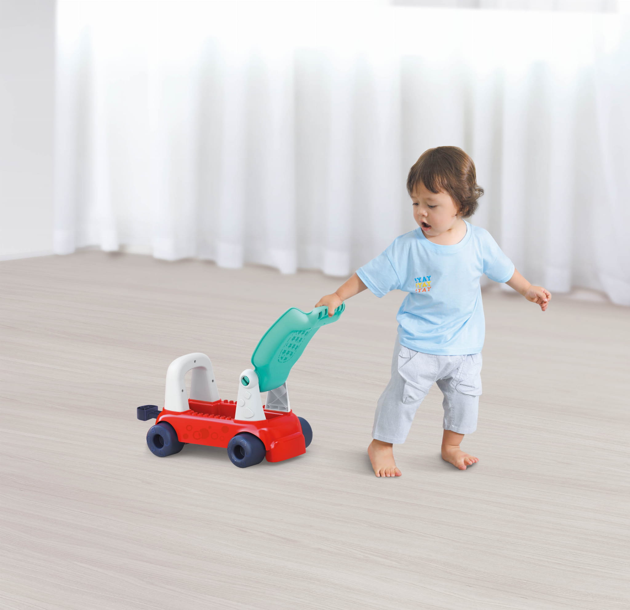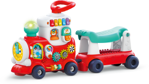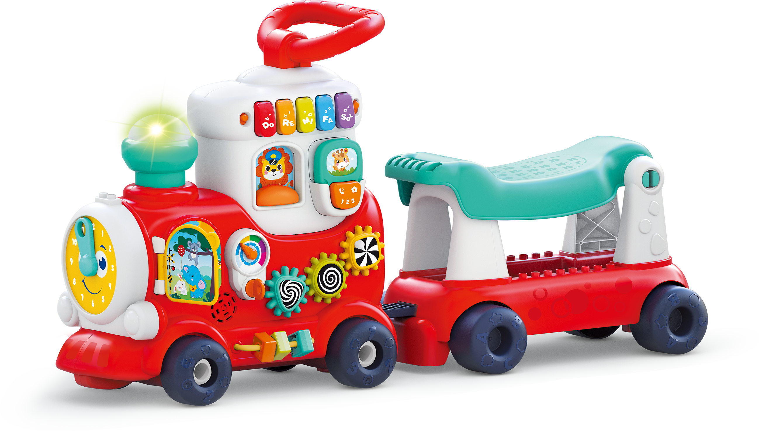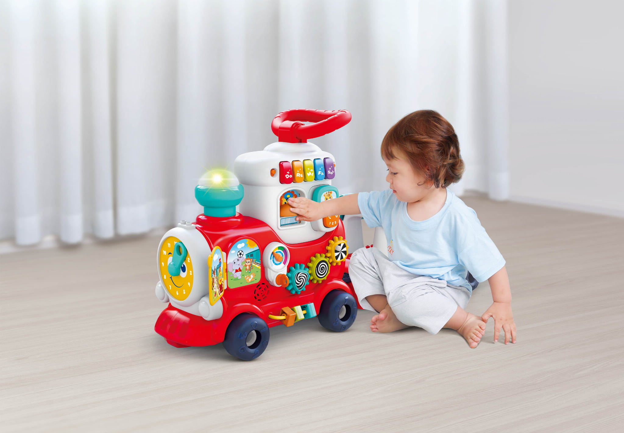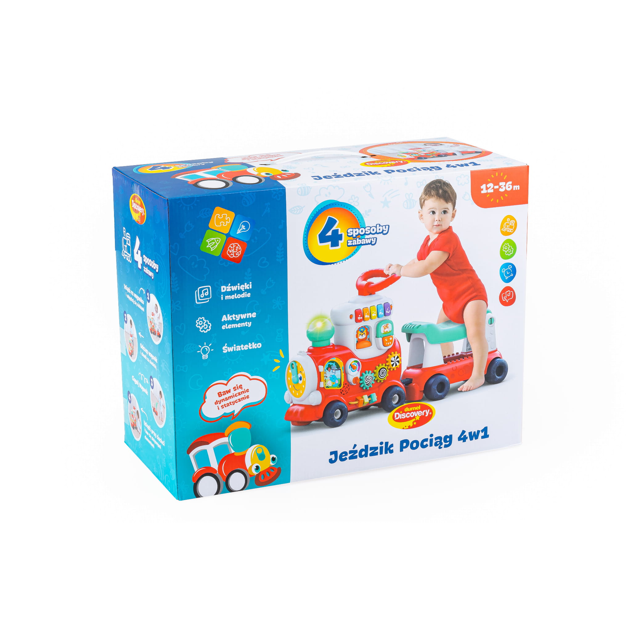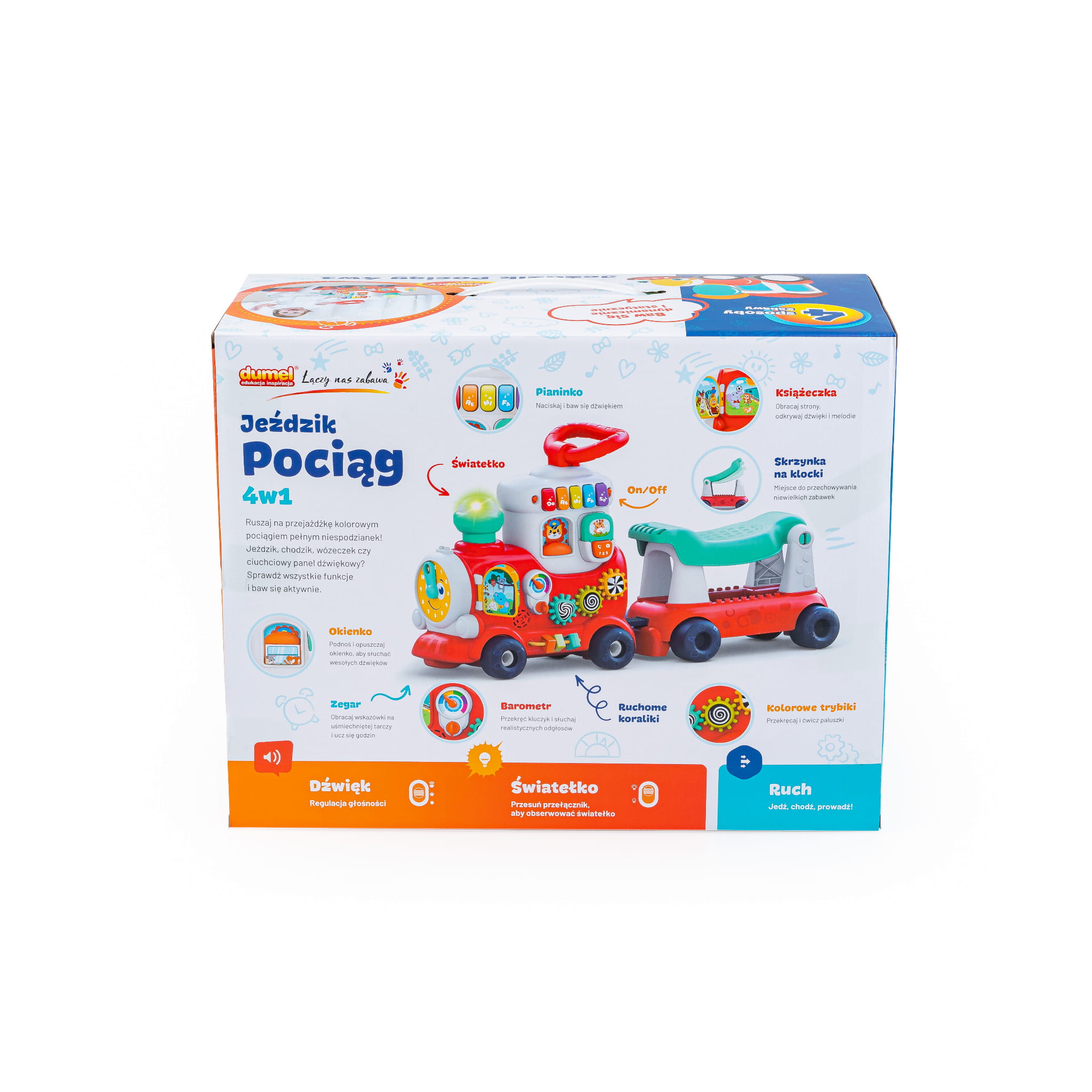 Kolorowy pociąg zabierze malucha na przejażdżkę z atrakcjami! Wyposażony jest w aż 4 różne tryby: siedzenie na wagoniku i odpychanie się nóżkami, odczepienie wagonika i chodzenie za ciuchcią, ciągnięcie wagonika, siedzenie przy ciuchci i zabawa aktywnymi elementami. Na małych odkrywców czeka tu wiele zadań, z pomocą których ćwiczyć mogą sprawność paluszków: tarcza zegara z ruchomą wskazówką, koraliki do przesuwania, książeczka ze stronami do przewracania, kolorowe trybiki do kręcenia i pianinko do tworzenia własnej melodii! Jeździk wyposażony został w światełko, wesołe dźwięki oraz melodie, a także regulację głośności, co pozwala dostosować go do potrzeb malucha.