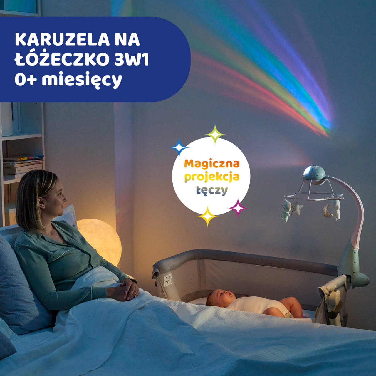Karuzela na łóżeczko 3w1 z pilotem oraz melodiami klasycznymi, new age i odgłosami natury, a także innowacyjną tęczową projekcją.