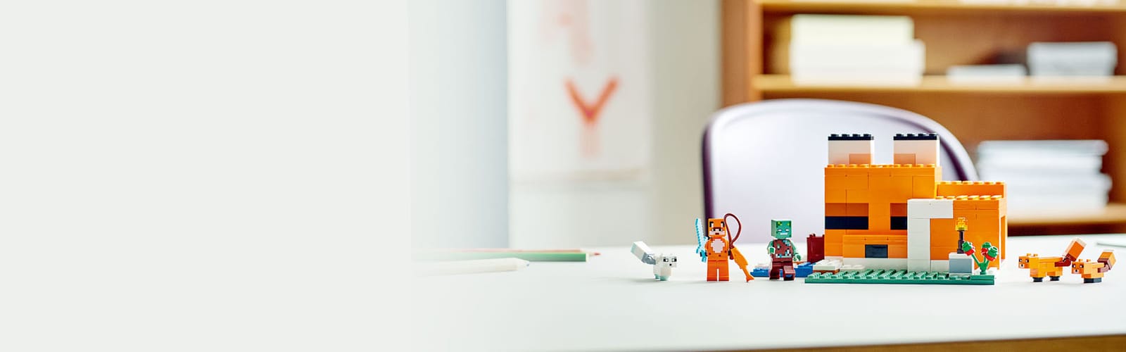 Dzieci mogą wykorzystać swój talent do grania w Minecrafta i skonstruować dom, który wygląda jak śpiący lis. Tył domu jest otwarty, a dach można podnieść, żeby ustawić w środku meble i pobawić się w odgrywanie ról. Na zewnątrz można spotkać małego liska, dorosłego lisa i lisa polarnego. Gdy dzieci nakarmią je słodkimi jagodami, zwierzaki zwiną się w kłębek i pójdą spać. Popularny mob z gry — utopiec — wprowadza element chaosu do zabawy. Dzieci muszą przegonić go mieczem, zanim będą mogły wziąć wędkę i spokojnie zająć się łowieniem ryb.
