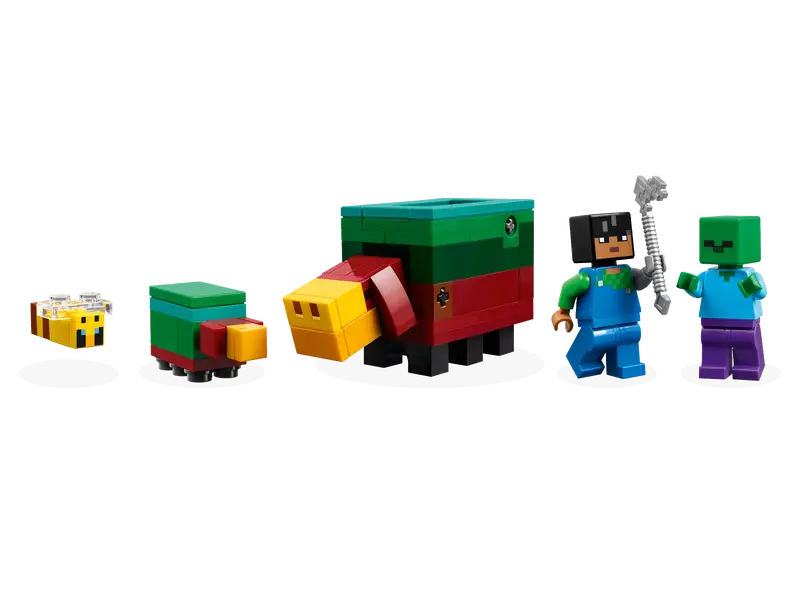 - Zabawa w biomie wiśniowego ogrodu — zawiera figurkę Sunny’ego z Minecrafta®, dwie pszczoły, niuchacza z funkcją kopania obsługiwaną palcem, małego niuchacza oraz jajo moba