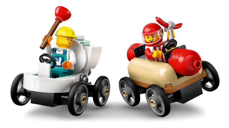 Zestaw zawiera cudaczne wyścigówki – hot doga i toaletę.