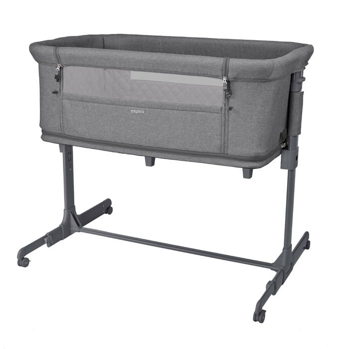 espiro cloud ma solidny stelaż z czterema kółkami, dzięki czemu można je łatwo przesuwać z miejsca na miejsce. Łóżeczko to bez problemu dopasujesz do łóżka rodziców. Umożliwia to funkcja regulacji wysokości na 5 poziomach. W ten sposób ustawisz je tak, aby jego materac znajdował się na wysokości Twojego materaca – zapewnisz sobie wygodny dostęp do maluszka. Równocześnie istotne jest to, by łóżeczko idealnie dopasowało się do łóżka rodziców. Umożliwia to system regulacji wychylenia bocznego nóżek.