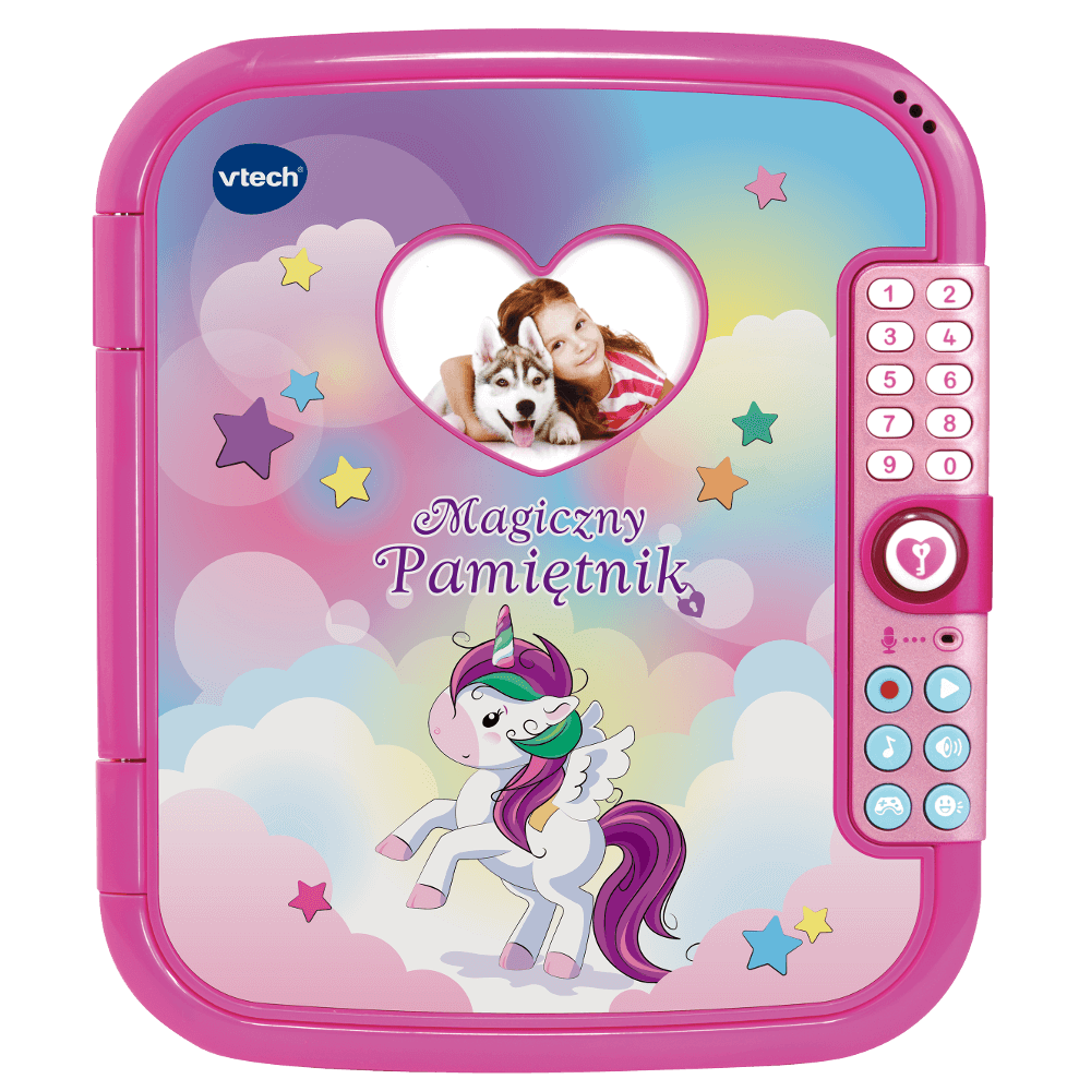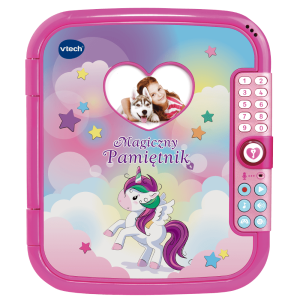 Magiczny pamiętnik marki VTech to wspaniały notes, w którym można zapisać sekrety i ochronić je przed odczytaniem za pomocą hasła! Na okładce znajduje się miejsce na zdjęcie właścicielki. Magiczny Pamiętnik posiada wbudowaną możliwość nagrywania dźwięków i ich odtwarzania. Za pomocą cyfr umieszczonych na froncie można zapisać hasło do pamiętnika oraz odtwarzać nagrania głosowe. Pamiętnik posiada również funkcję modyfikatora głosu oraz grę matematyczną „Znajdź cyfrę”. W środku znajduje się notesik z wyznaczonymi specjalnie miejscami na sekrety oraz dane właścicielki. Obok notesu w środku jest specjalnie miejsce na kolorowy pisak, który dołączony jest do zestawu. Pod notesem znajduje się specjalny schowek na skarby.