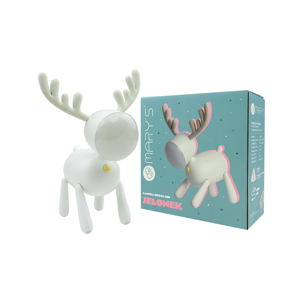 Lampka jelonek posiada ruchome nóżki i główkę, dzięki czemu można regulować kąt padania światła lampki i dostosować do własnych potrzeb. Lampka świeci w dwóch trybach mocniejszym i słabszym. Temperaturę źródła światła można zmienić na chłodniejszą bardziej niebieską lub cieplejszą bardziej żółtą. Lampka jelonek występuje w dwóch kolorach beżowym i białym.