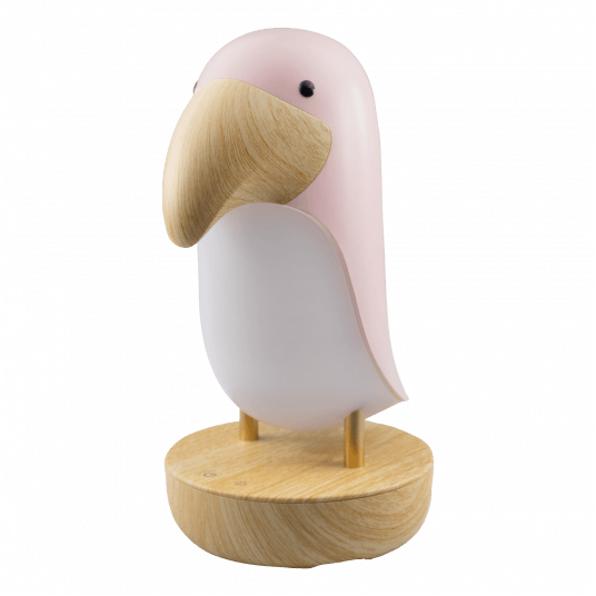 - Różowy kolor oraz nowoczesny design tukana sprawiają, że lampka jest atrakcyjnym dodatkiem do każdego wnętrza.