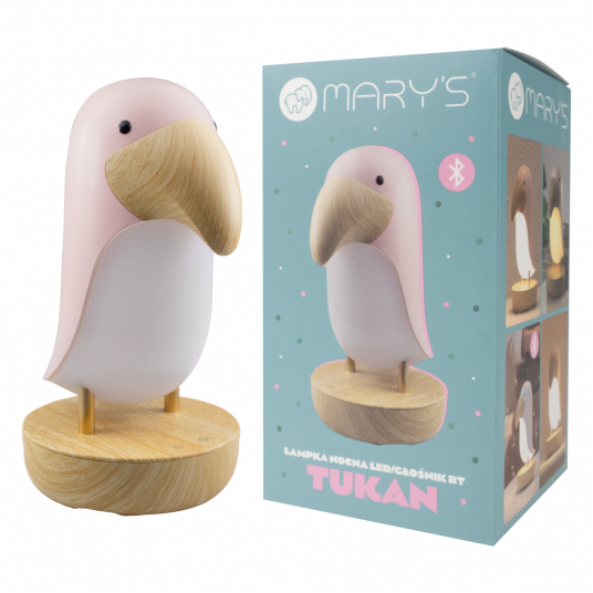 MARY'S TUKAN RÓŻOWY WW + BLUETOOTH SPEAKER to wyjątkowe połączenie lampki nocnej i głośnika Bluetooth w jednym stylowym urządzeniu. Idealna do sypialni, pokoju dziecięcego czy salonu, łączy funkcję przytulnego oświetlenia z wysokiej jakości dźwiękiem, w eleganckim różowym wydaniu.