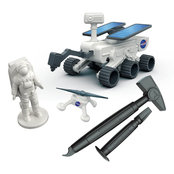Zestaw zawiera gipsową cegłę, młotek i dłuto do odkopania i wydobycia na światło dzienne łazika marsjańskiego, drona, astronauty i fragmentu meteorytu!