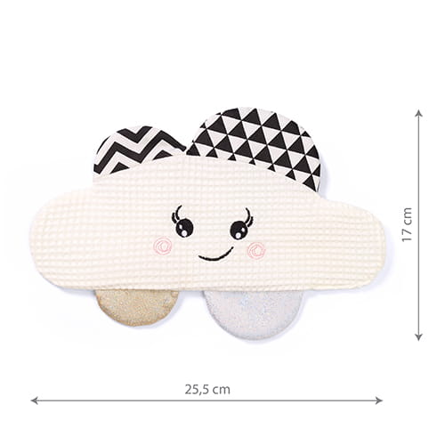Szeleścik w kształcie chmurki stymuluje rozwój zmysłów dziecka poprzez zabawę. Ta przytulanka i zabawka w jednym jest wykonana z miękkiej bawełny. W środku znajduje się szeleszczące wypełnienie. Szeleścik pomaga ćwiczyć koordynację różnych zmysłów. Wspiera zdolności poznawcze niemowlęcia. Różne faktury pobudzają rozwój zmysłu dotyku. Kontrastowe kolory i desenie stymulują zmysł wzroku, a duże oczy i przyjemny uśmiech sprawiają, że chmurka zachęca do aktywności.