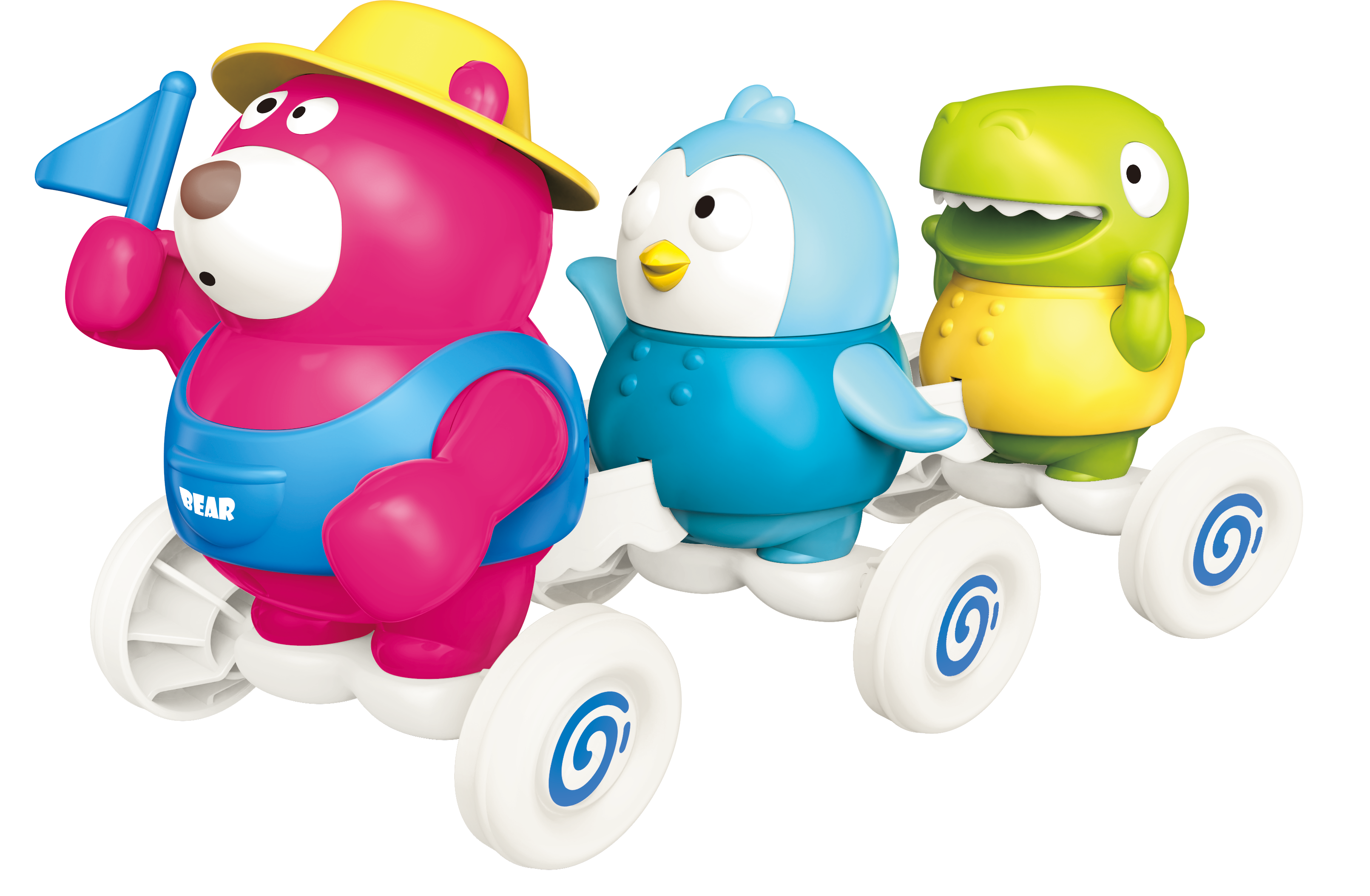 Podczas jazdy, zwierzaki kołyszą się na boki, podobnie jak kółeczka pojazdu, które ozdobione są wzorkiem, przez co ich poruszanie się wywołuje ciekawy efekt wizualny. Pociąganie za sznureczek uruchamia zabawne dźwięki i melodie, które umilą zabawę.