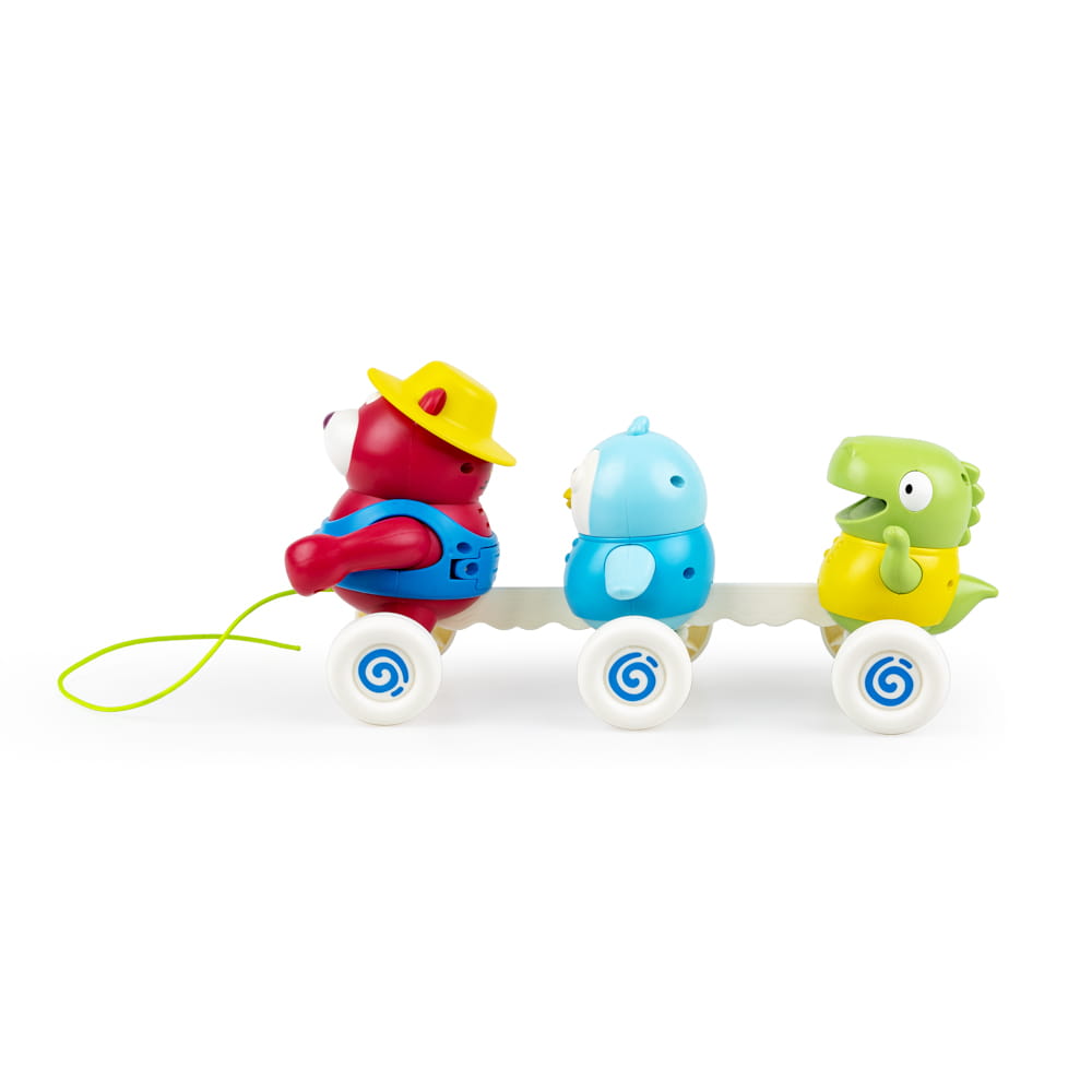 Pociąg z trzema wesołymi pasażerami czeka na przejażdżkę! Zabawka wyposażona jest w sznureczek do prowadzenia rączką.