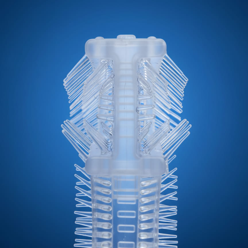 - Setki miękkich, silikonowych wypustek docierają do przestrzeni międzyzębowych.