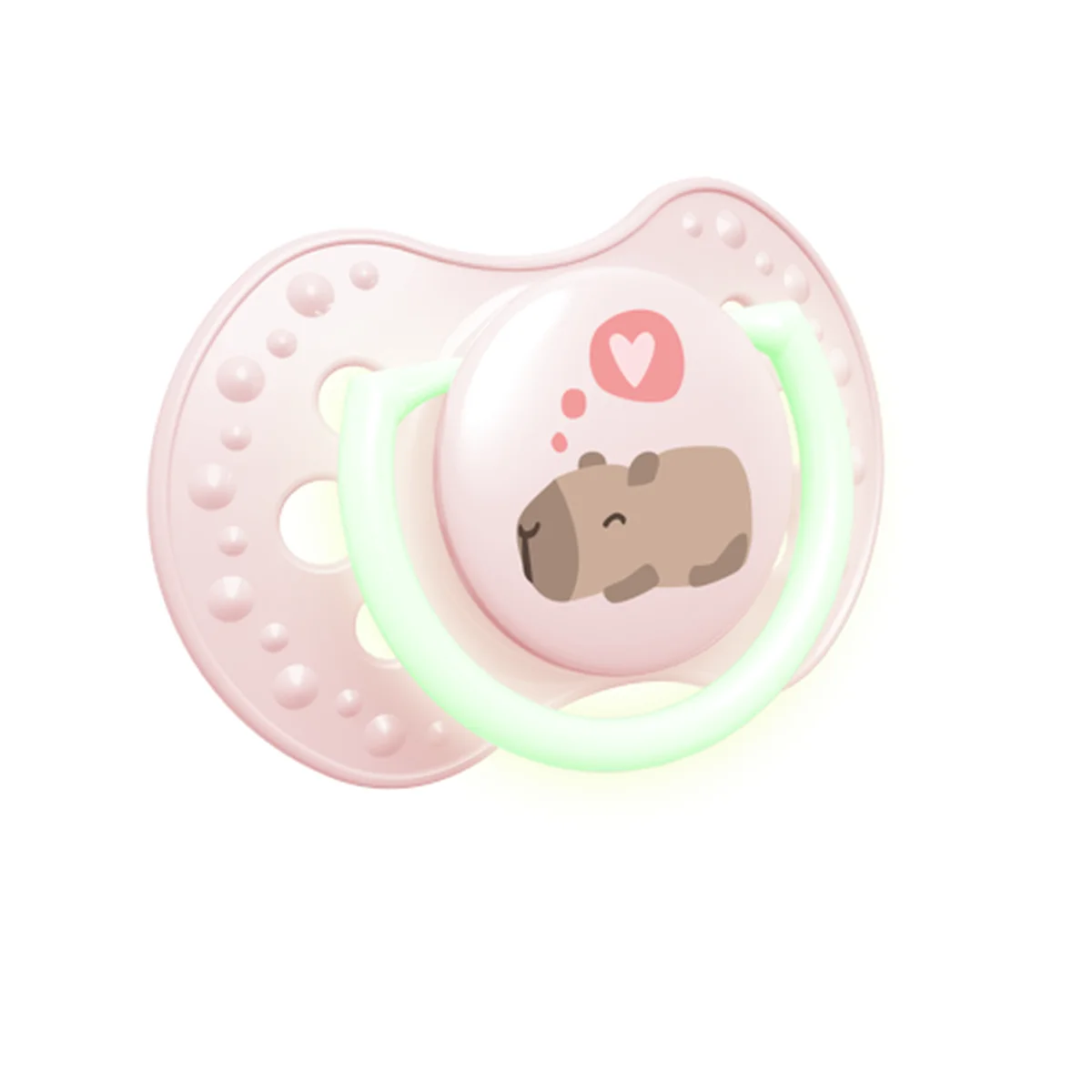 Jeden ze smoczków w zestawie posiada uchwyt, a drugi kapsel świecący w ciemności, co ułatwia znalezienie smoczka w nocy.