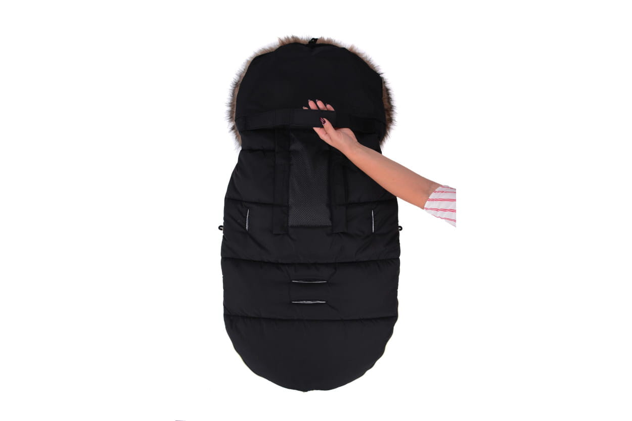 - uniwersalny system wpinania pięciopunktowych pasów bezpieczeństwa, (w tym dwa podłużne otwory częściowo zapinane na rzepy umożliwiają idealne dopasowanie pasów zapewniając izolację w śpiworku po ich wpięciu), otwory pasują również do wózków z nierozdzielnymi pasami,