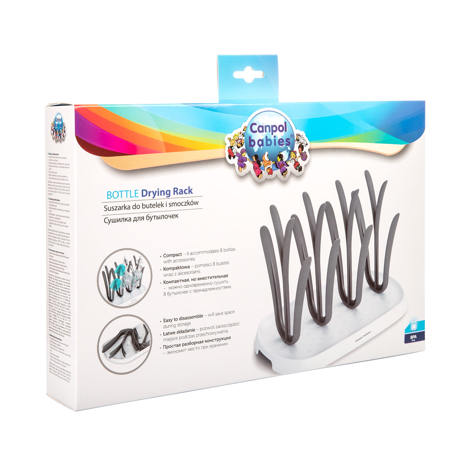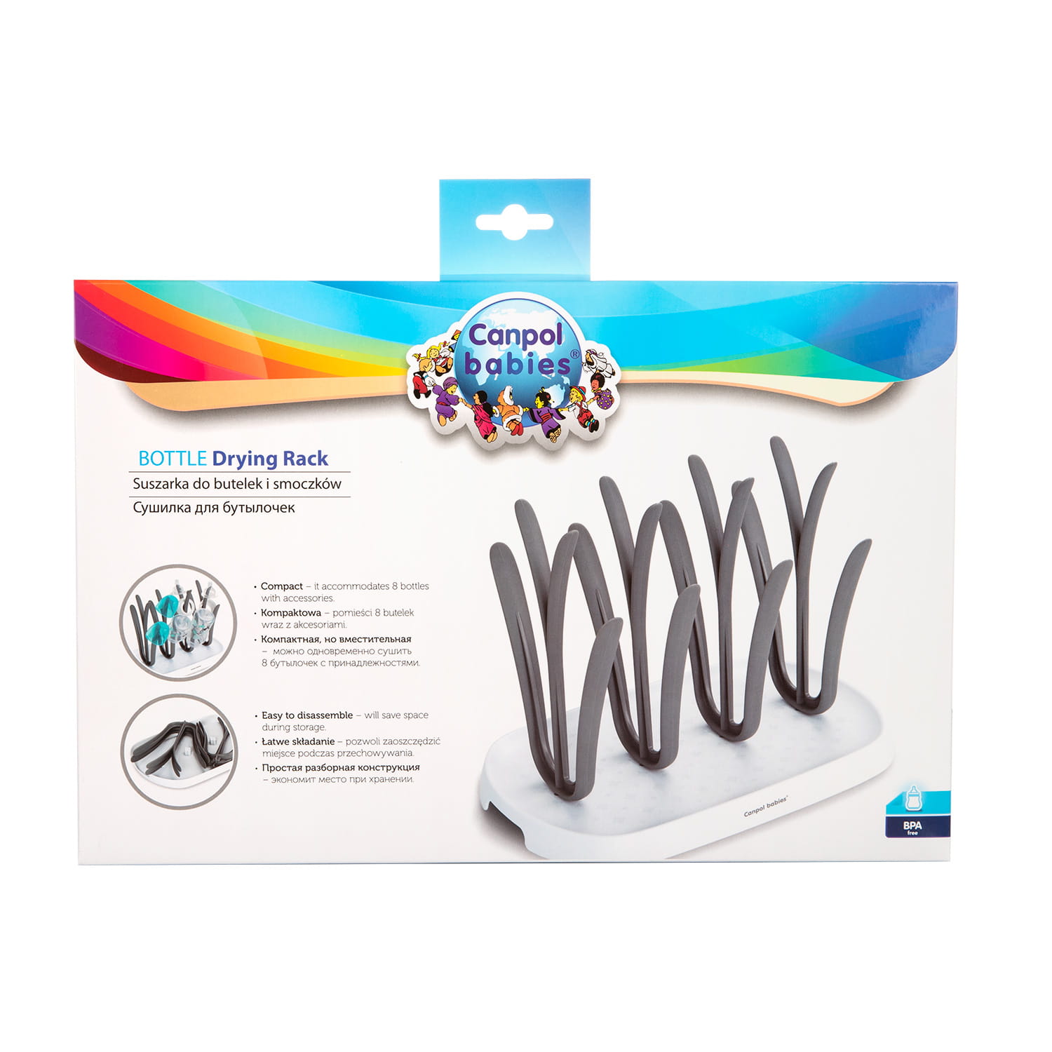 Suszarka Canpol babies została zaprojektowana tak, by pomieścić aż 8 butelek wraz z akcesoriami. Dzięki ruchomym widełkom, łatwo się składa i zajmuje niewiele miejsca. Jest też lekka, poręczna i łatwa do utrzymania w czystości.