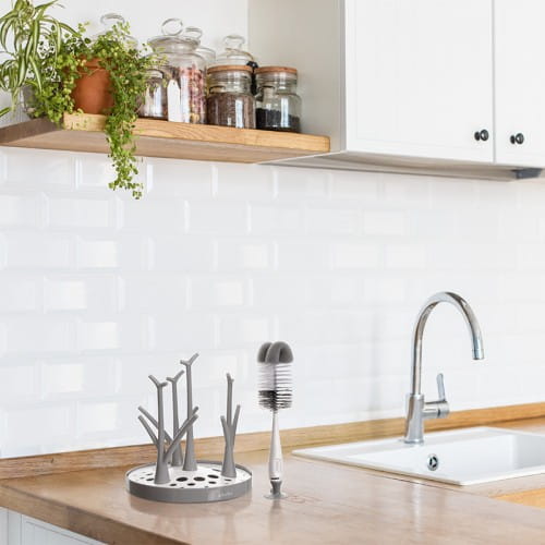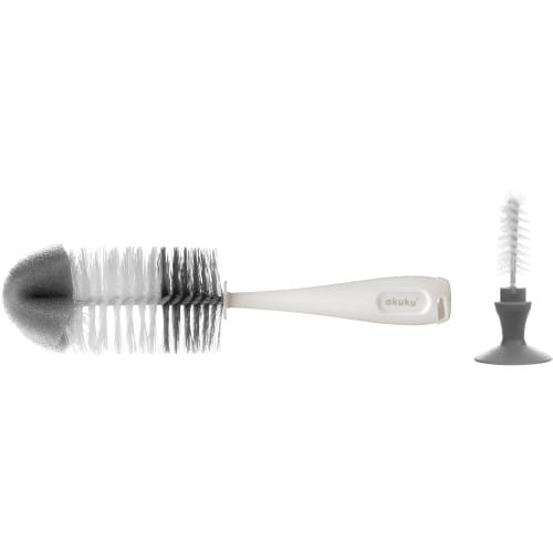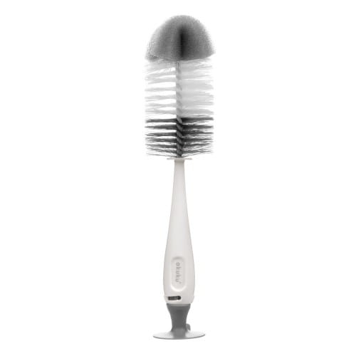 Szczotka zakończona miękką gąbeczką pomaga w dokładnym czyszczeniu zarówno butelek jak i smoczków. Samostojąca, na przyssawce, która umożliwia przyczepienie jej do gładkich powierzchni, dla ułatwienia osychania. W uchwycie rączki ukryta jest mała szczotka do czyszczenia smoczków. Miękkie włosie szczotek i gąbka docierają do trudno dostępnych miejsc. Szczotki wykonane są z trwałych i bezpiecznych materiałów, nie zawierających bisfenolu A.