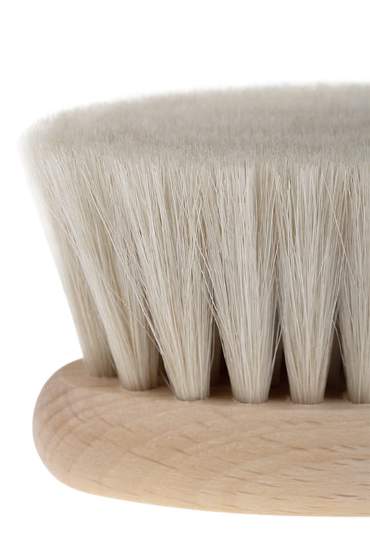Wykonana z naturalnego koziego włosia z drewnianą ( drewno bukowe) rączką o kształcie elipsy. Rozmiar szczotki jest idealny do małej główki niemowlaka. Delikatne włosie jest idealne dla wrażliwej skóry, nie elektryzuje włosów. Masaż wykonany tą szczotką doskonale wycisza i relaksuje, jest przyjemny dla mamy i dziecka.