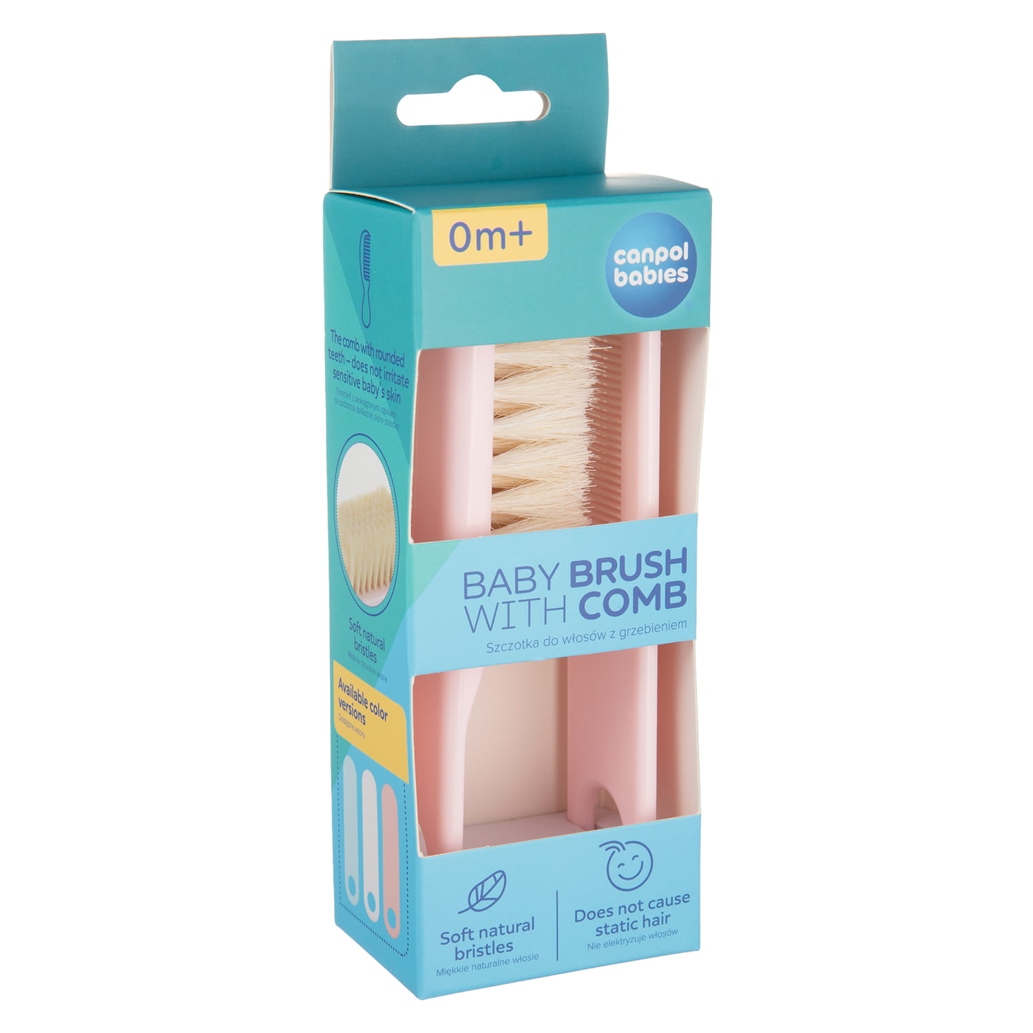 Canpol babies szczotka i grzebień z miękkim, naturalnym włosiem to zestaw, którego potrzebujesz do codziennej pielęgnacji włosów maluszka już od pierwszych dni po urodzeniu. Grzebień ma specjalnie zaokrąglone ząbki, które nie podrażniają wrażliwej skóry. Szczotka może służyć do delikatnego masażu główki. Ponieważ została wykonana z naturalnego włosia, nie elektryzuje delikatnych włosów maluszka.