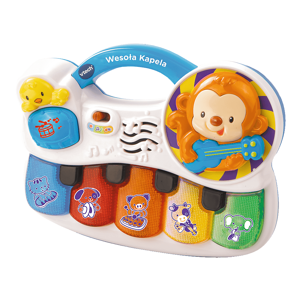 Urocze pianinko zaprasza najmłodsze dzieci do zabawy! Zabawka posiada 5 kolorowych, podświetlanych klawiszy. Na każdym z nich znajduje się zwierzątko trzymające instrument muzyczny. Naciśnięcie przycisku sprawia, że poznajemy nazwy i dźwięki instrumentów oraz zwierzątek. Nauka kolorów: niebieski, czerwony, pomarańczowy, żółty, zielony. Wesołej kapeli przewodzi małpka, która wygrywa melodie oraz piosenki. Naciśnięcie przycisku bębenka sprawia, że usłyszymy realistyczne dźwięki uderzania w bębenek. Występ zaczynamy, zawsze razem gramy!