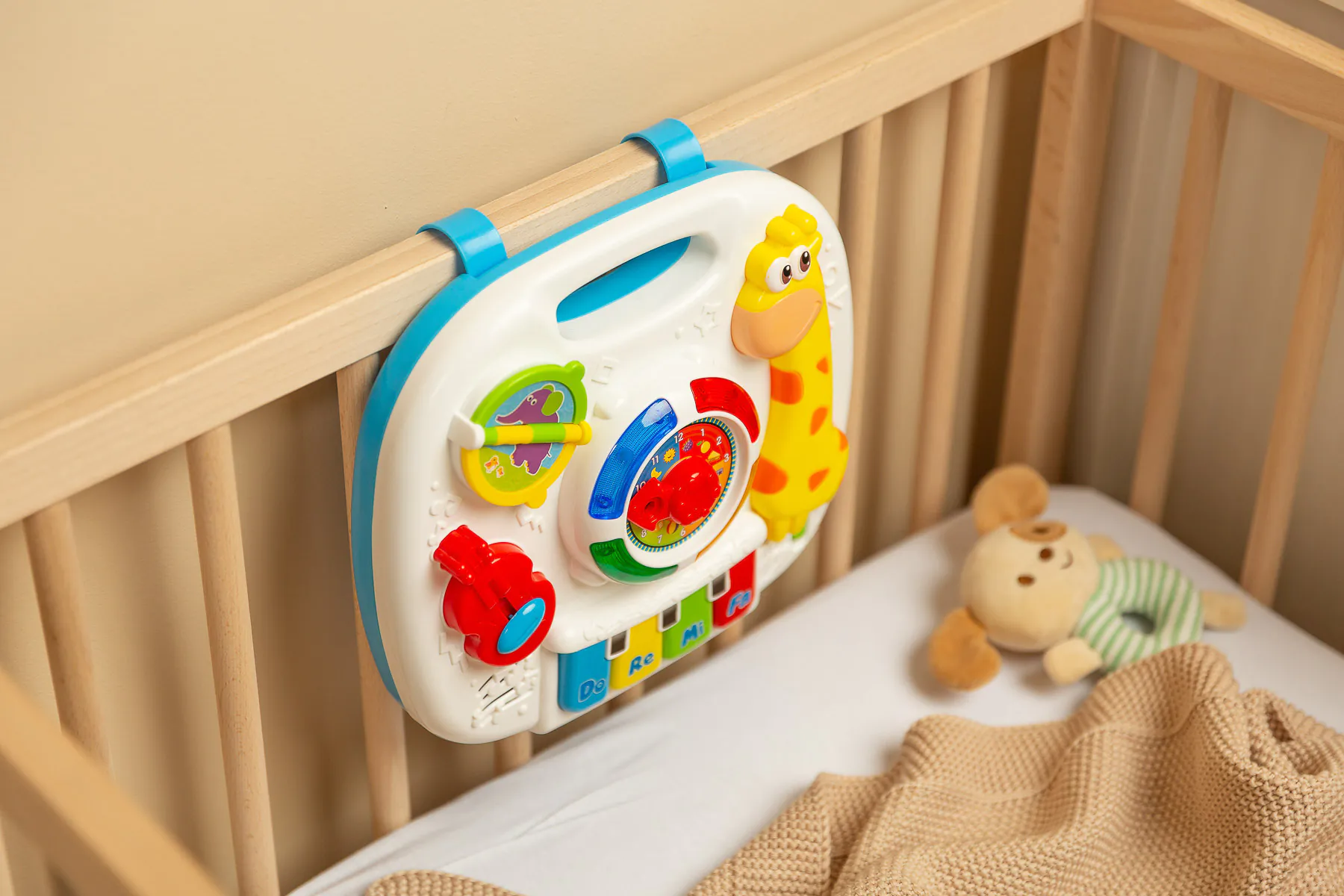 - Jako panel zawieszony na poprzeczce – dzięki zastosowaniu pasków umieszczonych na spodzie zabawki.