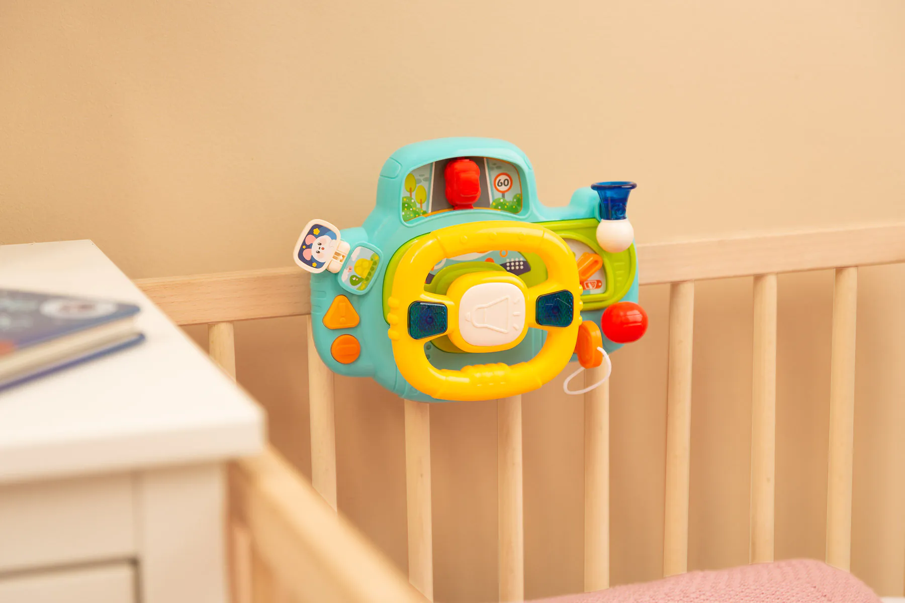 Edukacyjna Kierownica od TOYZ to kolorowa zabawka, która umili czas Twojego brzdąca. Panel kierownicy zawiera przyciski i światełka, które współgrają z głośnikiem wydającym przyjemne melodie i dźwięki samochodu.
