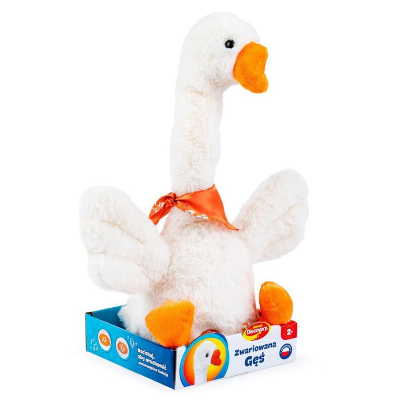 Ta gąska czuje rytm jak mało kto! Naciśnij na przycisk z nutką, znajdujący się na jej brzuchu, aby podziwiać jak tańcuje, trzepocząc skrzydłami i kręcąc podświetloną na kolorowo szyją. Gęś mówi w języku polskim, więc zabawi malucha nie tylko tańcem, ale też wesołymi zwrotami, które wypowiada. Dodatkowo, wyposażona jest także w funkcję nagrywania, a za jej aktywowanie odpowiada drugi przycisk, z ikonką mikrofonu. Po nagraniu dowolnego dźwięku, gęś odtworzy dźwięk, modyfikując jego brzmienie. Produkt przeznaczony jest dla dzieci od 2 roku życia.